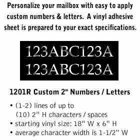 2" Reflective Vinyl Custom Numbers for Drop Box2" Reflective Vinyl Custom Numbers for Drop Box. Please enter your custom requirements below. Be sure to include only what you wish to appear. ![]() |